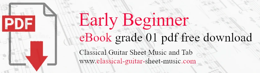 Classical guitar tablature for Early Beginner, Book level 1, 72 Pieces, 100 pages – 1,7 Mo Link > https://www.classical-guitar-sheet-music.com/free-classical-guitar-tabs/