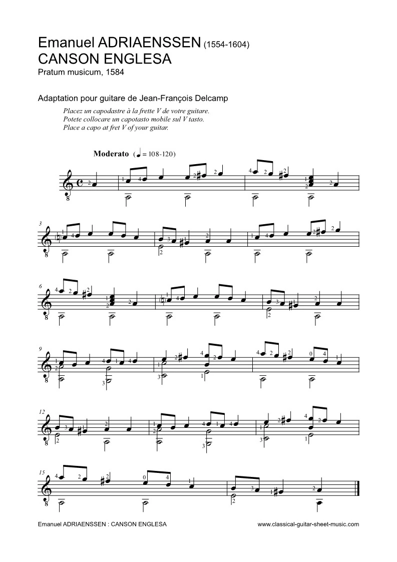 Content : Anonyme : Greensleeves – Gwin ar c’hallaoued – Maro Pontkalleg – Passemeze – Valse en sol – Vidalita – O cravo e a rosa – Carnavalito – Samba lele – Nesta rua – Giorgio Mainerio : Schiarazula Marazula – Guillaume Morlaye : Gaillarde – Adrian Le Roy : Branles de Bourgogne n° 1 et 3 – Emmanuel Adriaenssen : Branle anglais – Santino Garsi da Parma : Correnta – Francis Cutting : Packington’s Pound – Gaspar Sanz : Abecedario italiano – Canciones – Clarin de los mosqueteros – Clarines y trompetas – Dance de las hachas – Españoleta – Folias – Gallarda – Jacaras – La Buelta – La Coquina Francesa – La Garzona – La minima de Portugal – La Miñona de cataluña – Lantururu – Las hachas – Le Esfacheta de Napoles – Paradetas – Pavana – Rujero – Johann Kaspar Fischer : Gavotte – Turlough O’Carolan : Brian Boru’s March – Johann Sebastian Bach : Menuets BWV 1007 – Michel Corrette : Aux armes camarades – Ramonez-ci ramonez-là – Joseph Haydn : Menuet – Ferdinando Carulli : Allegretto – Andante – Arpeggi – 2 Valses – Prélude 4 opus 114 – Antonio Nava : Valse – Fernando Sor : Exercice n°1 et 2 opus 35 – Leçons opus 60 n°7, 11, 12, 13 et 14 – Niccolò Paganini : Ghiribizzi 1, 23 – Valtz – Dionisio Aguado : Egercicios n°4 et 7 Op.6 – Ejercicio n°4 – Leccion n°15 et 19 – Matteo Carcassi : Allegretto – Andantino – Marche – Valse – José Ferrer Y Esteve : Ejercicio n°9 – Jean-François Delcamp : Tango – Malagueña fácil – Avec la gamme pentatonique – Préambule – En barque – Exercices : Accords – Arpèges – Cejilla – Éteintes des résonances – Extensions – Gammes – Glissando – Legato, staccato – Liaisons – Mordants et trilles – Improvisation.